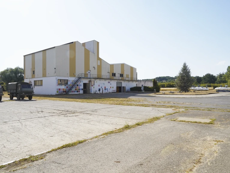 La Piazza costituisce uno spazio centrale di connessione all’interno di Les Moulins. Da un lato si affacciano laboratori, depositi e spazi di produzione; dall’altro il paesaggio fluviale con alberi, vegetazione e percorsi naturali.